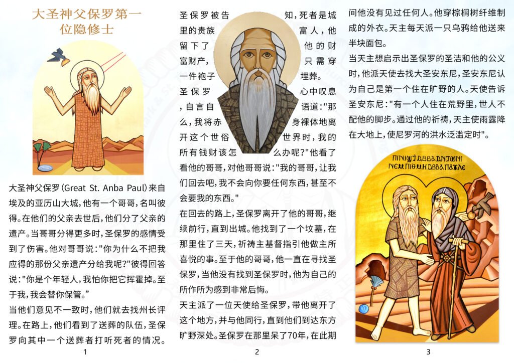 大圣保罗神父(Great St. Anba Paul)来自埃及的亚历山大城,他有一个哥哥,名叫彼得。在他们的父亲去世后,他们分了父亲的遗产。当哥哥分得更多时,圣保罗的感情受到了伤害。他对哥哥说:”你为什么不把我应得的那份父亲遗产分给我呢?”彼得回答说:”你是个年轻人,我怕你把它挥霍掉。至于我,我会替你保管。”