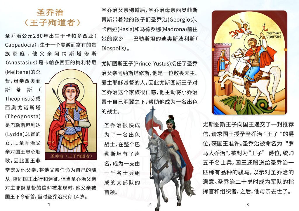 圣乔治父亲殉道后,圣乔治母亲西奥菲斯蒂斯带着她的孩子们圣乔治(Georgios)、卡西娅(Kasia)和马德罗娜(Madrona)前往她的家乡——巴勒斯坦的迪奥斯波利斯(Diospolis)。