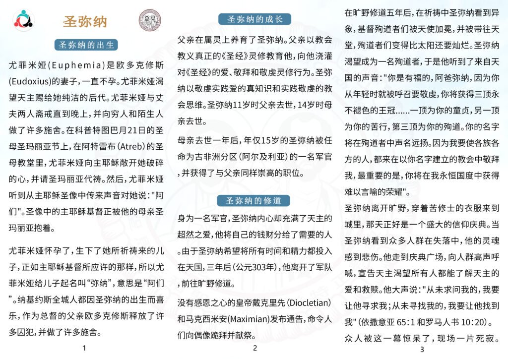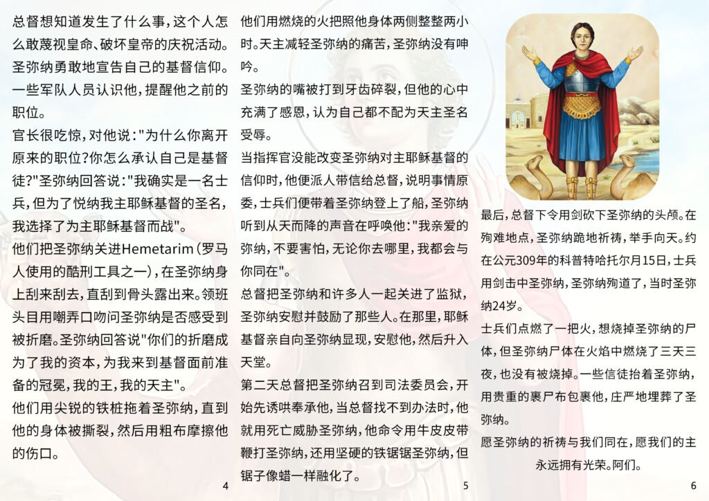 官长很吃惊,对他说:”为什么你离开原来的职位?你怎么承认自己是基督徒?”圣弥纳回答说:”我确实是一名士兵,但为了悦纳我主耶稣基督的圣名,我选择了为主耶稣基督而战”。