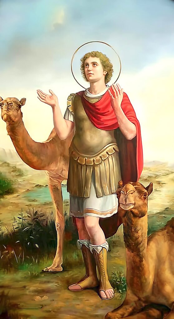 身为一名军官,圣弥纳内心却充满了天主的超然之爱,他将自己的钱财分给了需要的人。由于圣弥纳希望将所有时间和精力都投入在天国,三年后(公元303年),他离开了军队,前往旷野修道。