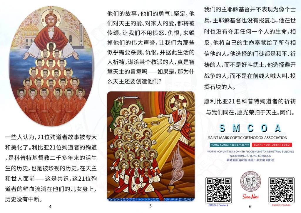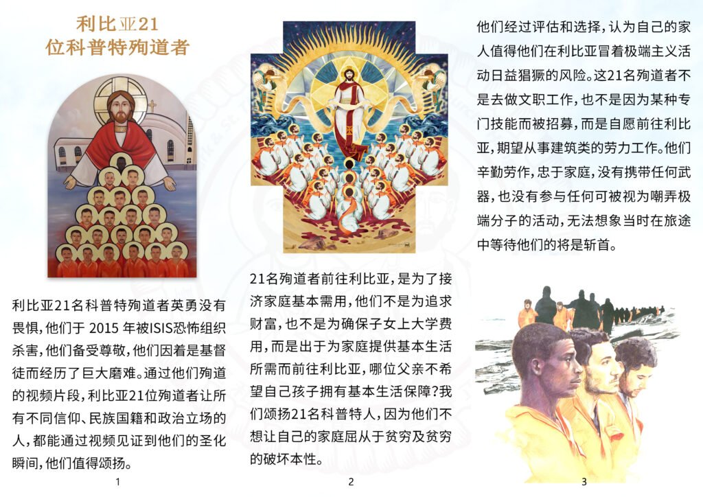 利比亚21名科普特殉道者英勇没有畏惧,他们于 2015 年被ISIS恐怖组织杀害,他们备受尊敬,他们因着是基督徒而经历了巨大磨难。通过他们殉道的视频片段,利比亚21位殉道者让所有不同信仰、民族国籍和政治立场的人,都能通过视频见证到他们的圣化瞬间,他们值得颂扬。