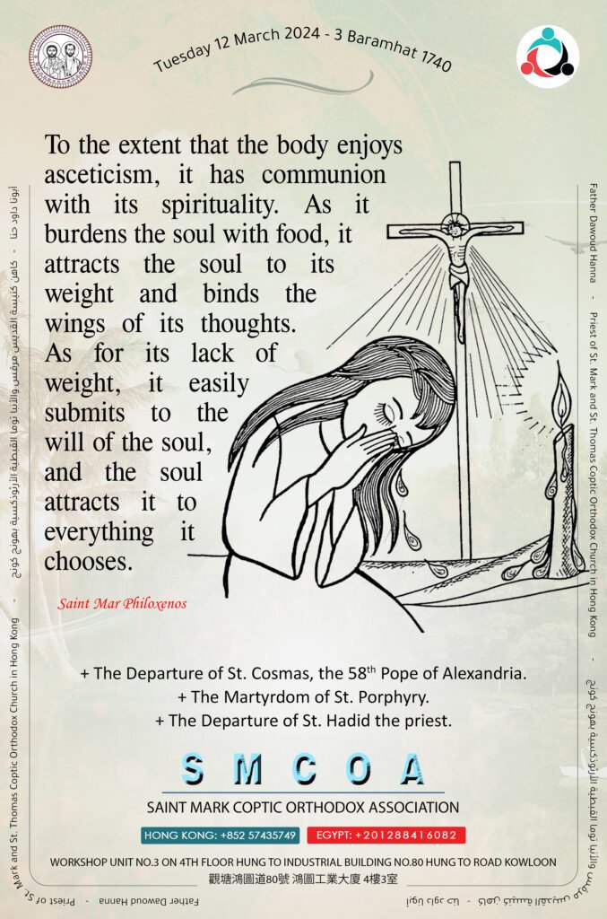 To the extent that the body enjoys asceticism, it has communion with its spirituality. As it burdens the soul with food, it attracts the soul to its weight and binds the wings of its thoughts. As for its lack of weight, it easily submits to the will of the soul, and the soul attracts it to everything it chooses.