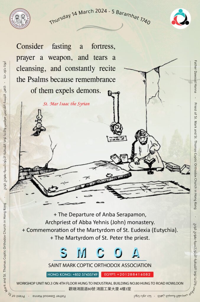 Consider fasting a fortress, prayer a weapon, and tears a cleansing, and constantly recite the Psalms because remembrance of them expels demons.