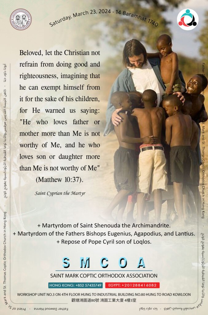 Beloved, let the Christian not refrain from doing good and righteousness, imagining that he can exempt himself from it for the sake of his children, for He warned us saying: “He who loves father or mother more than Me is not worthy of Me, and he who loves son or daughter more than Me is not worthy of Me” (Matthew 10:37).