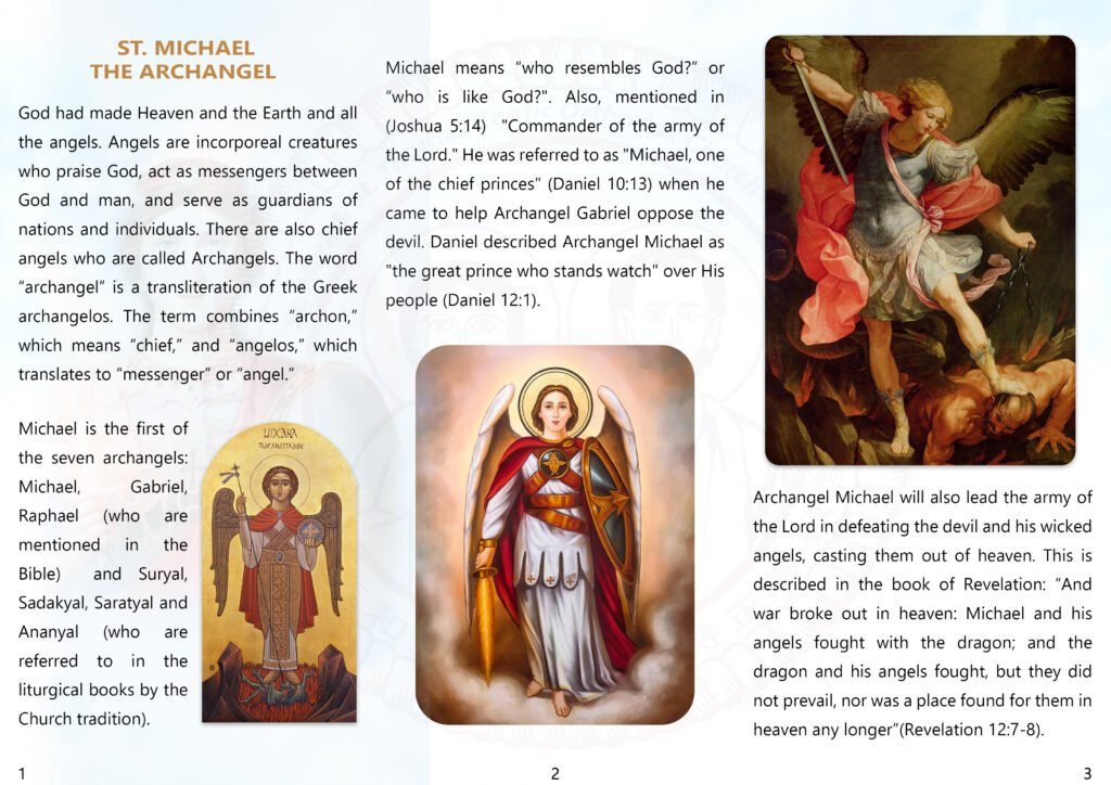 Michael is the first of the seven archangels: Michael, Gabriel, Raphael (who are mentioned in the Bible) and Suryal, Sadakyal, Saratyal and Ananyal (who are referred to in the liturgical books by the Church tradition).
